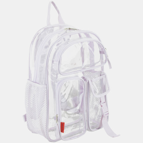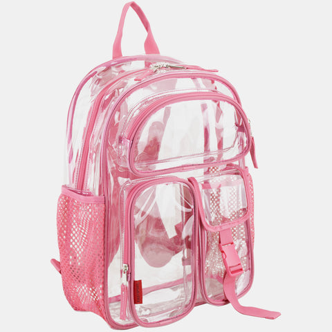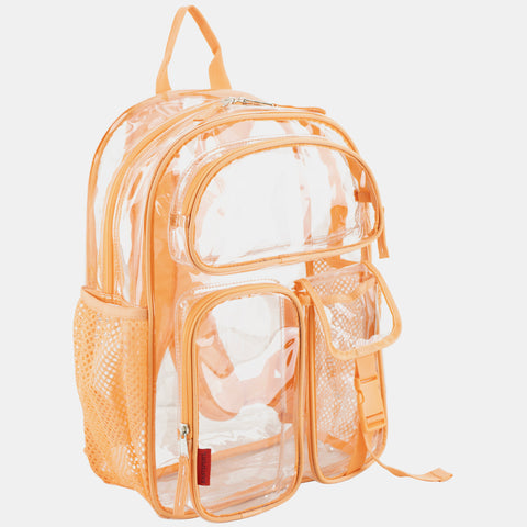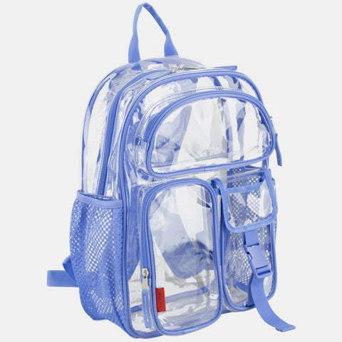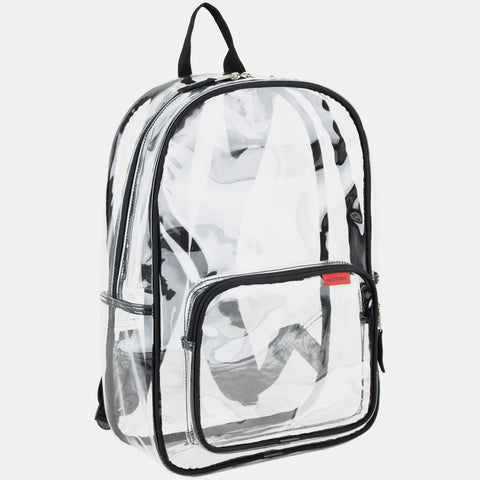 The Eastsport Multi-Purpose Clear Wide Mouth Backpack provides plenty of storage space for books, school supplies and more. The clear PVC material makes it easy to quickly identify and find contents at all times. It is also suitable for travel and is capable of being used by a child or adult. The straps of this PVC backpack are adjustable for a comfortable fit and easier carrying and load distribution. A front pocket and the main pocket seal shut with heavy-duty zippers, securing earphones and other small items. The backpack also comes with a top handle, which allows for hanging on a hook, on a door or in a locker.
